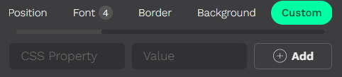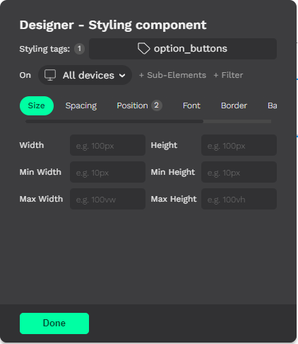 <table><thead><tr><th width="292">Image</th><th width="146.33333333333331">Name</th><th>Description</th></tr></thead><tbody><tr><td><img src="https://2080030610-files.gitbook.io/~/files/v0/b/gitbook-x-prod.appspot.com/o/spaces%2FgFafh00YOojEhbybq4uG%2Fuploads%2FNC2vUuKJphNOw3V0fUSa%2Fimage.png?alt=media&#x26;token=121a8024-2291-4c0c-8ed6-15afbb5d1d2c" alt=""></td><td>Designer Card</td><td>This is the whole Designer card.</td></tr><tr><td><img src="https://2080030610-files.gitbook.io/~/files/v0/b/gitbook-x-prod.appspot.com/o/spaces%2FgFafh00YOojEhbybq4uG%2Fuploads%2FFKtV3niSgGgZJciI0ut9%2Fimage.png?alt=media&#x26;token=1d089cee-df2e-4cd4-b63b-a5455a2a81f1" alt=""></td><td>Styling Tags</td><td>With our builder, we <strong>ALWAYS</strong> style tags (CSS classes). So if the component you've selected doesn't have one, please "<strong>Add a tag</strong>" now.</td></tr><tr><td><img src="https://2080030610-files.gitbook.io/~/files/v0/b/gitbook-x-prod.appspot.com/o/spaces%2FgFafh00YOojEhbybq4uG%2Fuploads%2Fpv0Tbrxn0LW4Vax248wK%2Fimage.png?alt=media&#x26;token=1ea85ead-4c2c-4e22-ab97-5219873df4a3" alt="" data-size="original"></td><td>Refining Selector</td><td>You may want to set a <strong>more specific selector</strong>. You can specify it <strong>by device</strong> or even by different <strong>parts of a component</strong>. For example, you may want to style a button's image when viewed on a mobile device for a specific tag, but only on this page. By refining the selector, you'll be fine-tuning your styles.</td></tr><tr><td><img src="https://2080030610-files.gitbook.io/~/files/v0/b/gitbook-x-prod.appspot.com/o/spaces%2FgFafh00YOojEhbybq4uG%2Fuploads%2FUizjVgwgM9oi8k1s5tkx%2F2023-03-10_15h32_21.png?alt=media&#x26;token=e8146bf7-c8e8-45b1-9875-d1c329b9d307" alt="" data-size="line"></td><td>Screen sizes</td><td>Here you can choose on which kind of device (<strong>screen size-related</strong>) the styles you set are going to be applied. The default option is "<strong>All devices</strong>", which sets styles for computer screens. You can also choose "<strong>Tablet</strong>" or "<strong>Mobile</strong>".</td></tr><tr><td><img src="https://2080030610-files.gitbook.io/~/files/v0/b/gitbook-x-prod.appspot.com/o/spaces%2FgFafh00YOojEhbybq4uG%2Fuploads%2FKrRQE6xWhWyDLD1316c6%2Fimage.png?alt=media&#x26;token=361bd1fd-24d3-4baf-b697-538e68d6d790" alt=""></td><td>+ Sub-Element</td><td>This dropdown will display a list of the <strong>sub-elements</strong> that the <strong>selected component</strong> has. From here, you can choose which specific sub-element you want to style.</td></tr><tr><td><img src="https://2080030610-files.gitbook.io/~/files/v0/b/gitbook-x-prod.appspot.com/o/spaces%2FgFafh00YOojEhbybq4uG%2Fuploads%2FiomQ3DV0tbke54SVE4el%2Fimage.png?alt=media&#x26;token=09041b03-5426-4f1c-abc0-94801bd05750" alt=""></td><td>+ Filter</td><td>In the "<strong>When</strong>" dropdown you'll find options like "<strong>hover</strong>", "<strong>disabled</strong>", "<strong>selected</strong>", etc. The options you'll see are going to depend on the kind of component you have selected.<br>Within the "<strong>In</strong>" dropdown, you'll be able to limit the <strong>reach of your tag</strong>. For example, you can select "<strong>This page</strong>" so that only the components with the tag you're styling and on this page would be affected by the styles you set.</td></tr><tr><td><img src="https://2080030610-files.gitbook.io/~/files/v0/b/gitbook-x-prod.appspot.com/o/spaces%2FgFafh00YOojEhbybq4uG%2Fuploads%2FdwFARYnMOGMa8DsP3H1r%2Fimage.png?alt=media&#x26;token=2607241b-1cf9-4941-b9ce-d10d937c21ef" alt=""></td><td>Card Tabs</td><td>Tabs are <strong>groups of CSS properties</strong> that make it easier for you to find the property you want to set. Depending on the kind of component you have selected, you'll see a different set of tabs. Keep in mind that not all CSS properties can be applied to all kinds of elements.</td></tr><tr><td><img src="https://2080030610-files.gitbook.io/~/files/v0/b/gitbook-x-prod.appspot.com/o/spaces%2FgFafh00YOojEhbybq4uG%2Fuploads%2FA9AV7ZmmaHrrYfeFjuJm%2Fimage.png?alt=media&#x26;token=f2211f9b-90d2-4647-bae2-5930d3231368" alt=""></td><td>Custom Properties</td><td>Not every <strong>CSS property</strong> is included on our tabs. If you want to use a <strong>not-so-common property</strong> and can't find it, you can always go to the last tab "<strong>Custom</strong>" and add any existing CSS property.</td></tr><tr><td><img src="https://2080030610-files.gitbook.io/~/files/v0/b/gitbook-x-prod.appspot.com/o/spaces%2FgFafh00YOojEhbybq4uG%2Fuploads%2FmbGSclyE28vnXJ7WcahE%2Fimage.png?alt=media&#x26;token=003be877-f05e-453f-8533-609afcf2544c" alt=""></td><td>Style Input Section</td><td>This is the Inputs area, which changes depending on the tab you have selected. In this image you can see the properties from the "<strong>Size</strong>" tab.</td></tr></tbody></table>